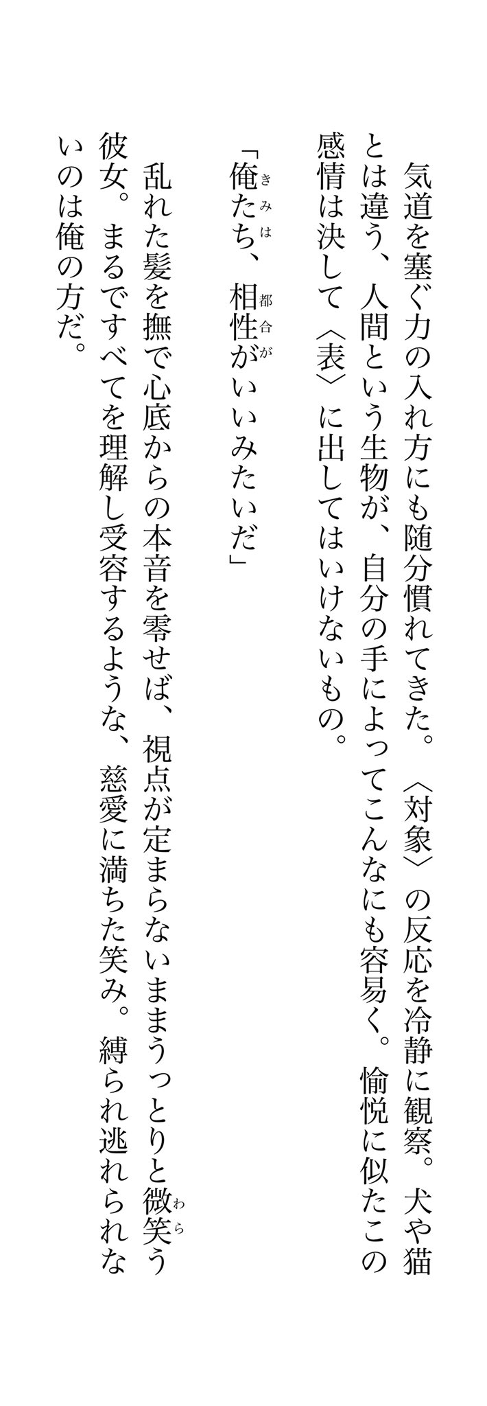 行為の最中、なにも考えられないくらい夢中にさせて。わたしの夢をみたと隣で笑って。今迄言えなかった「すき」を全部受け止めてくれて。たった数時間の逢瀬、濃密な空気を思い出すだけで疼いて。脚が震えてしまうほどに強い快感をまた味わいたくて。わたしが幾度もあの〈夜〉を抱きしめてしまうのは、