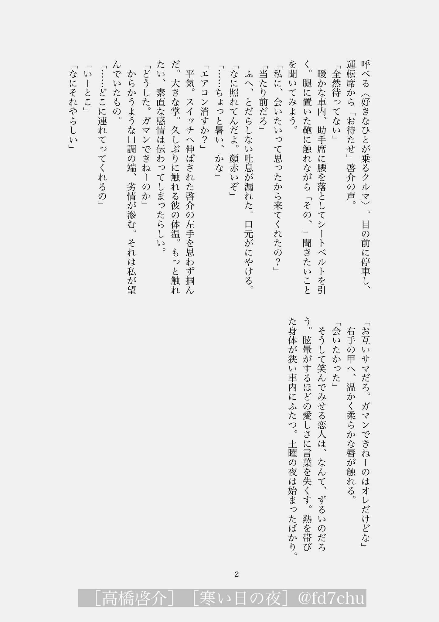 「お待たせ」「そんな待ってない。白セーター似合うね」「白いブラウス着るって言ったから合わせてみた」照れ笑いで差し出す掌。指先が触れて絡んで安心するのにそれ以上にドキドキして心臓が忙しい。「愛されてるって感じ」「もちろん。愛してるよ」手の甲へ唇が触れる。頬が色づく過程まで白日の下。