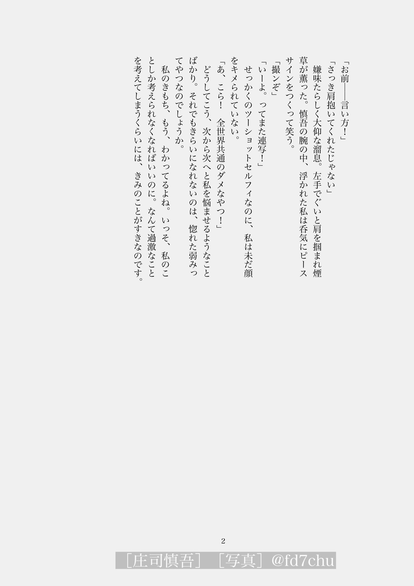 『明日空いてる?』会えば心をすり減らすとわかっていても、会える嬉しさが先に立つ。「わたしのこと好き?」愚問に困り笑いが返る。「嫌いなら会わないよ」優しく抱きしめられ、唇が唇を塞ぐ。僅か数ml注がれることを愛情──幸せのかたちと信じて疑わない。その他すべてから目を逸らして生きていく。
